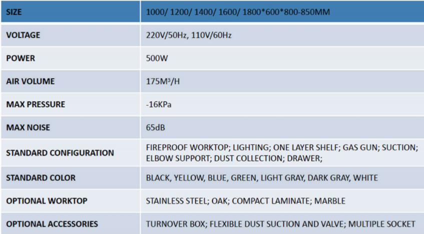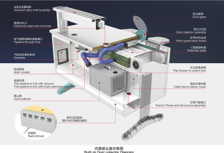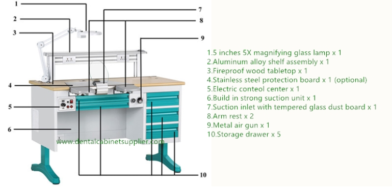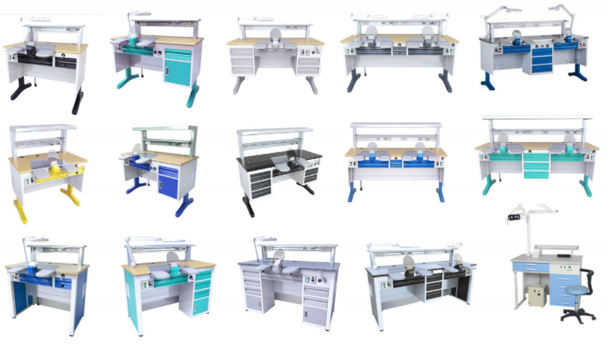 The dental technician's workbench is a special workbench for dental technicians to fabricate oral prostheses. The desktop is mostly made of wear-resistant and corrosion-resistant materials. Some desktops are equipped with slots or grooves to fix tools. There are drawers for storing small tools and accessories, and cabinets for placing large items. It is also equipped with adjustable lighting and multiple power sockets with protection functions.