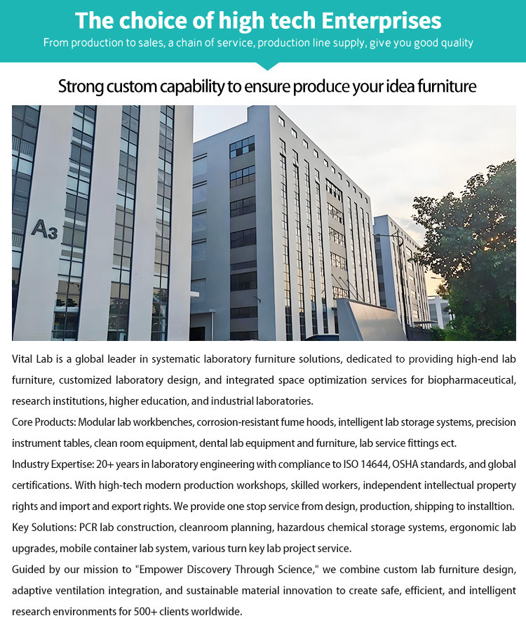 Vital Lab is a global leader in systematic laboratory furniture solutions, dedicated to providing high-end lab furniture, customized laboratory design, and integrated space optimization services for biopharmaceutical, research institutions, higher education, and industrial laboratories.Core Products: Modular lab workbenches, corrosion-resistant fume hoods, intelligent lab storage systems, precision instrument tables, storage cabinet, service fitting, container lab house, lab consumption, lab equipment ect.Industry Expertise: 20+ years in laboratory engineering with compliance to ISO 14644, OSHA standards, CE and global certifications.Key Solutions: PCR lab construction, cleanroom planning, hazardous chemical storage systems, ergonomic lab upgrades ect. Lab furniture design, production, installation ect.