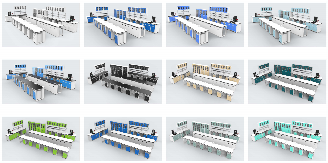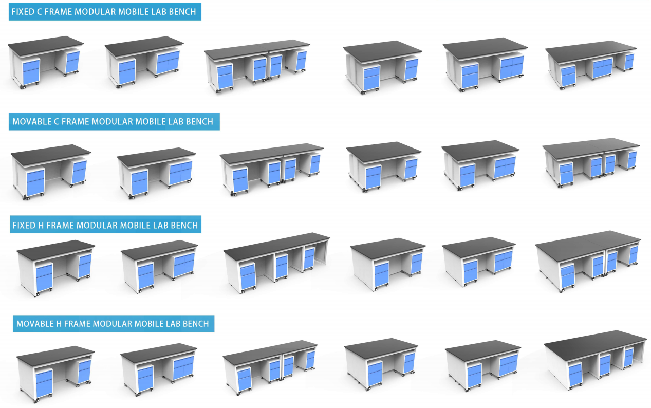 The modular mobile lab bench is composed of a countertop, steel frame, cabinet and wheels. Generally there are two common types of steel frames: H-shaped and C-shaped. One configuration is fixed steel frame with mobile cabinet, and the other configuration is that the steel frame is equipped with movable wheels. The cabinet can be hung on the steel frame and moved together, or cabinet with wheels to move separately too. There are a variety of styles available, ensuring ease of use and flexibility. The layout can be changed as the laboratory develops. It is the development trend of future experiments.