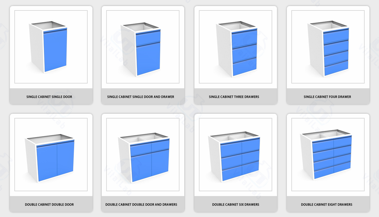Use E1 grade 18mm thickness double-sided high-quality environmentally friendly melamine door & drawer panel and 15mm thickness main body; all edges are treated with 2mm thickness high-quality PVC sealing for waterproofing, and all panels are connected by detachable three-in-one connection. It has a stable structure, good load-bearing performance and is easy to dismantle, which is conducive to use in the special working environment of the laboratory.