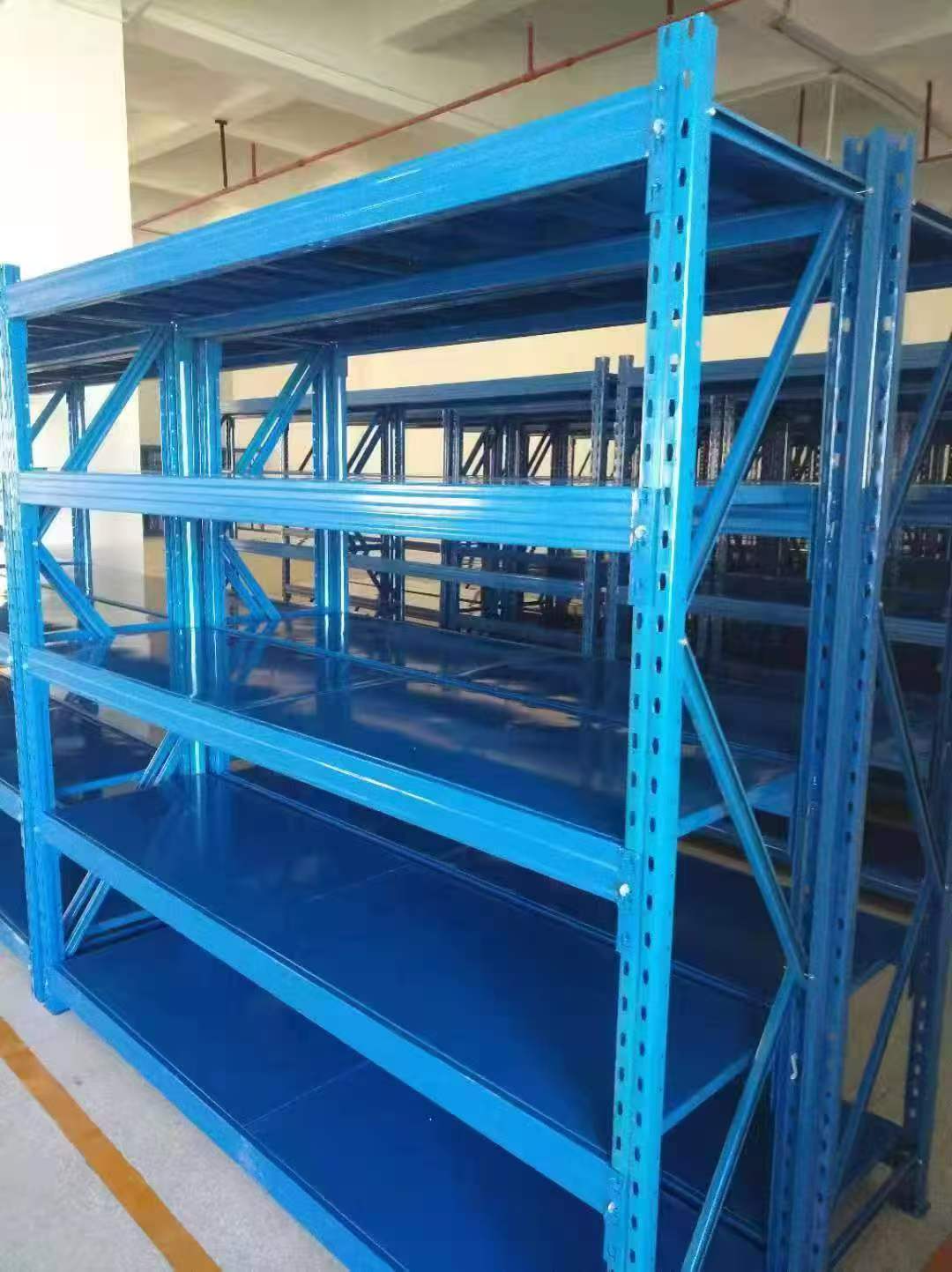 Medium-duty Combined Shelves: Each layer of the shelf board has a load-bearing capacity of three types, 300kg, 400kg, and 500kg. The structure is basically the same as that of light-duty shelves, but diagonal braces need to be added between the columns to increase stability. Its height and depth are the same as those of light-duty shelves, and the bay spacing can be 900-1800mm. It is suitable for storing items with a moderate weight, such as small mechanical equipment, parts, etc.